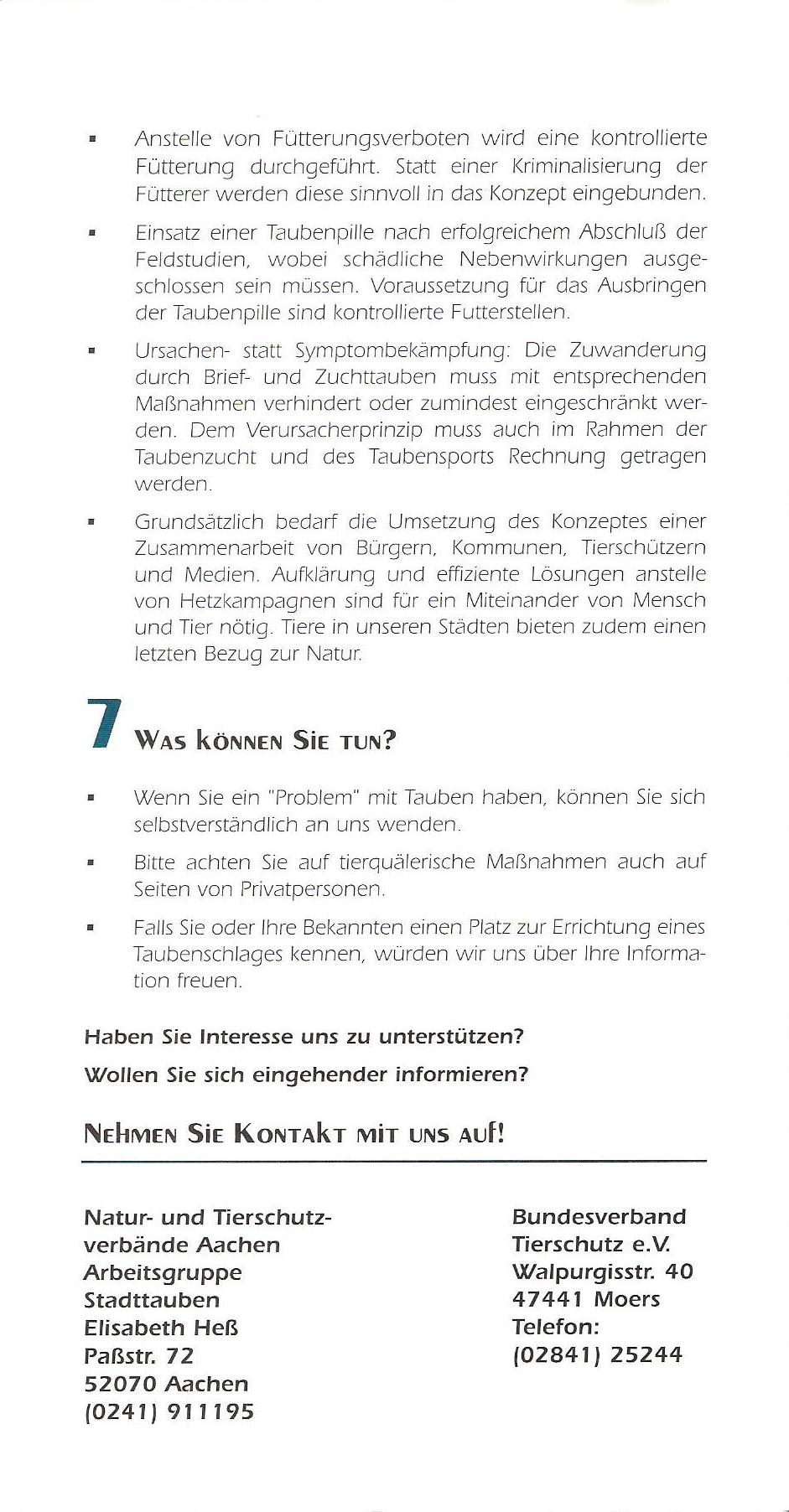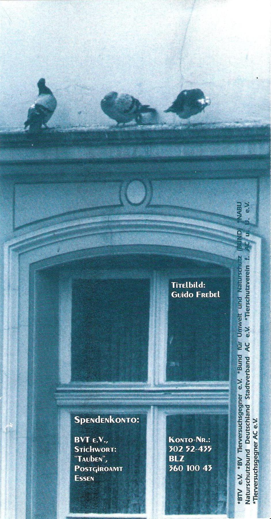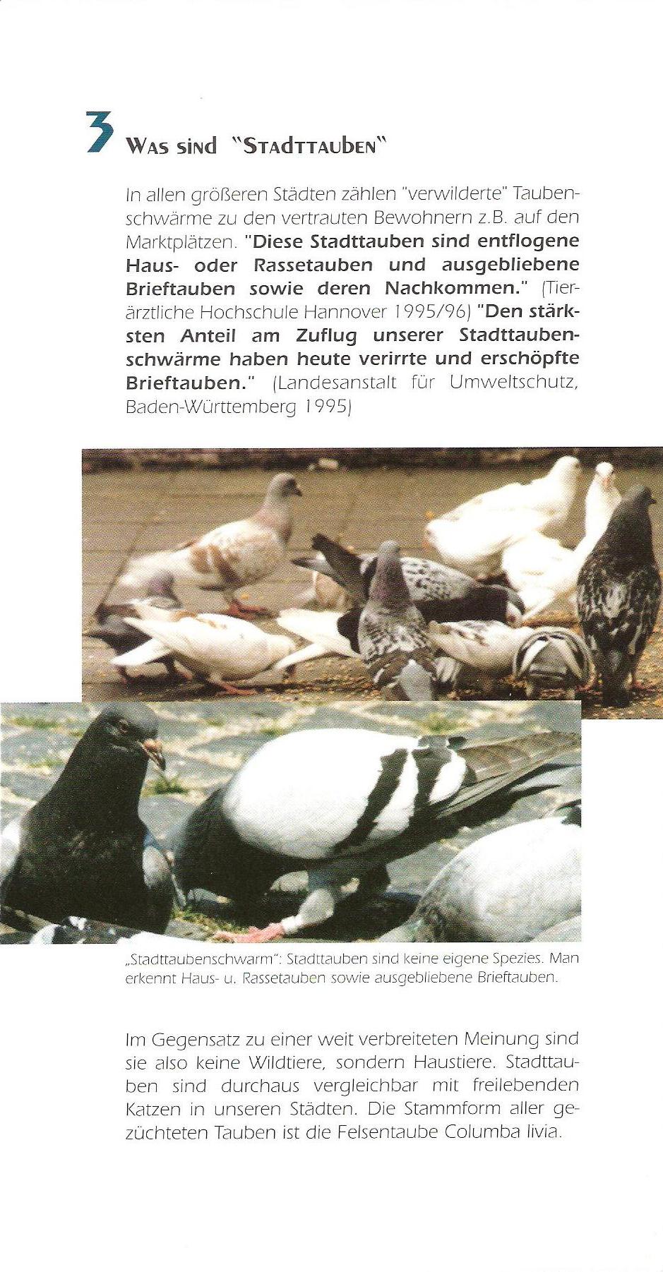 konnte also eine dauerhafte Reduzierung der Straßentaubenpopulation bewirken.*** *** *** Basel war die erste Stadt, die über eine tierschützerisch wie auch ökologisch sinnvolle und erfolgreiche Bestandsregulierung nachgedacht – und sich ernsthaft darum bemüht hat. 1988 wurde die „Baseler Taubenaktion“ unter Leitung des Tierschutzvereins in Kooperation mit der Universität und dem Sanitätsdepartement ins Leben gerufen. Zunächst wurden acht Taubenschläge in Dachböden öffentlicher Gebäude errichtet. Diese durch einen Beitrag des Kantons (Sanitätsdepartement) unterstützten Taubenschläge sollten vor allem demonstrieren, dass nicht beabsichtigt war, die Straßentauben auszurotten, sondern einen kleinen und gesunden Bestand anzustreben. Durch eine vorbildliche Tierhaltung sollte auch gezeigt werden, dass es nicht genügt, den Tauben einfach nur Futter hinzuwerfen. Die Schläge werden von einem Taubenwart und seinen Mitarbeiterinnen betreut und gereinigt. Die Tiere werden regelmäßig kontrolliert und mit Futter versorgt. Wenn die einzelnen Schwärme zu stark anwachsen, werden als sanfte Regulationsmassnahme befruchtete Eier aus den Nestern genommen und durch Attrappen ersetzt. Um die Tiere nicht dauerhaft zu frustrieren, werden nicht grundsätzlich a l l e Eier ausgetauscht. Die Brutpaare erzeugen in den Schlägen durchschnittlich zwei Junge pro Jahr Im Jahr 1993 wurden aus den acht Baseler Taubenschlägen insgesamt 1.392 Eier und 1.215 kg Kot entfernt, der sonst zur Verschmutzung von Gebäuden und Denkmälern beigetragen hätte. Die „Baseler Taubenaktion“ wurde von Radio, Fernsehen und Presse sehr gut aufgenommen. Viele Städte aus dem In und Ausland interessierten sich für das „Baseler Modell“, das anfangs die einzige tierschützerisch wie auch ökologisch erfolgreiche Bestandsregulation der Strassentauben darstellte. http://www.sncweb.ch/dossiers/tauben.htm